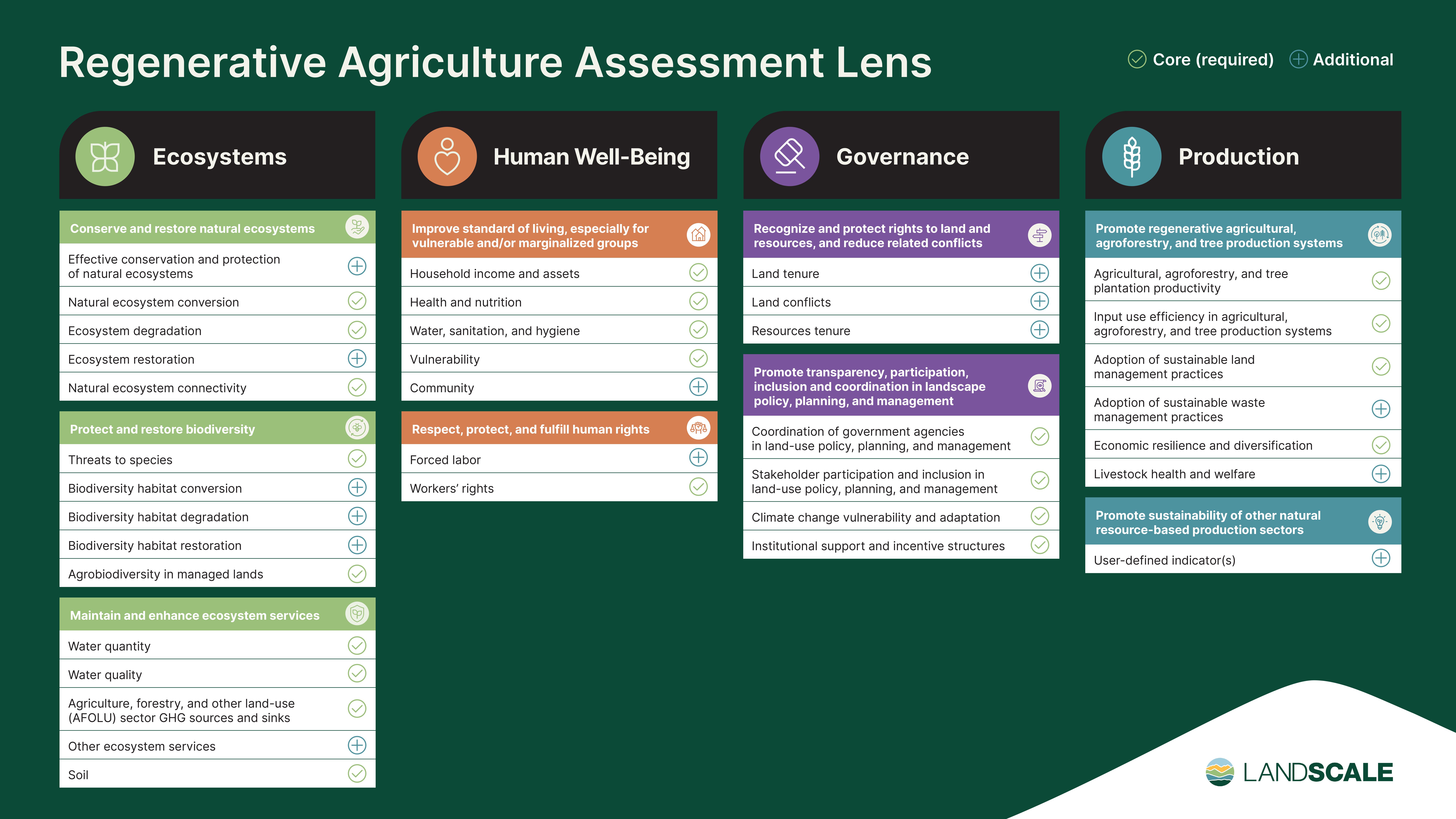<figure><img src="https://2485489819-files.gitbook.io/~/files/v0/b/gitbook-x-prod.appspot.com/o/spaces%2Fyud3YzDx40F5IFjw3cle%2Fuploads%2FVSbVBl4321lUe1svd4e7%2FLandScale_Infographic_Regenerative%20Agriculture%20Assessment%20Lens.jpg?alt=media&#x26;token=8065e4d8-cb35-4c73-9b03-4153ea9840ad" alt=""><figcaption></figcaption></figure>